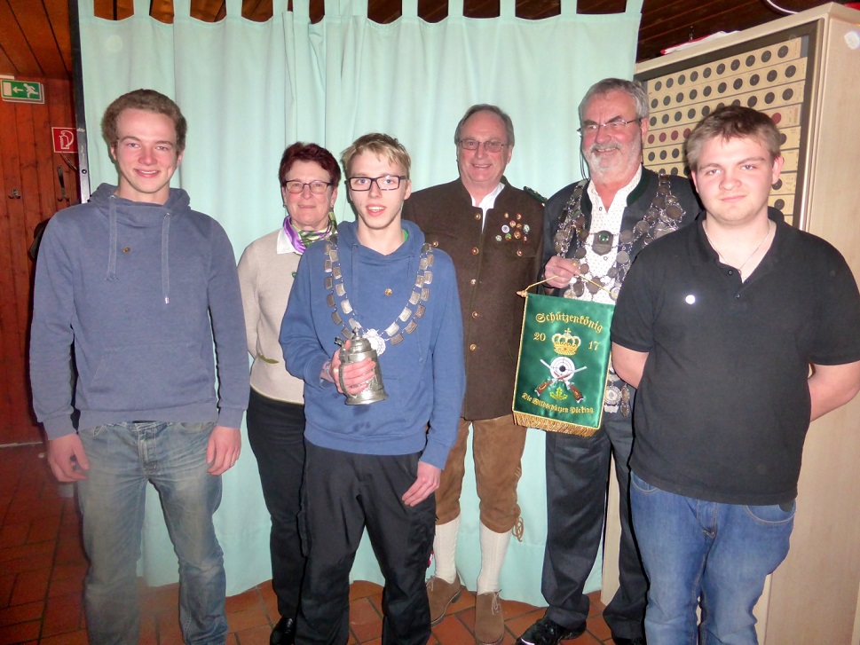 Das Jugendmitglied Patrick Roscher freute sich auf den bronzenen Ehrenkönigsplatz nach Vizekönig Maximilian Ammerl (423,6 Teiler). Jugendschützenkönig 2017 wurde Kevin Gappe (161,1 Teiler), herzlichen Glückwunsch Kevin!