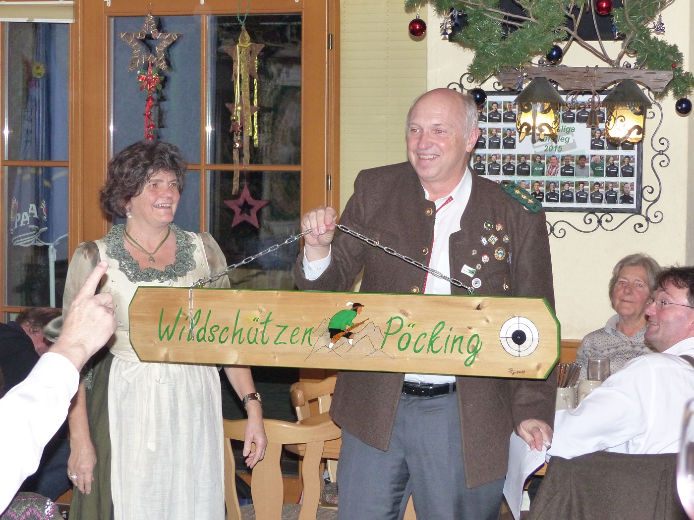 Nach den Reden wurde uns anwesenden Gästen ein alter Film vom Bau des jetzigen Schützenheims aus dem Jahre 1972/73 gezeigt. Zu sehen waren handwerklich arbeitende Kameraden, die mit ihrer Eigenleistung tatkräftig am Bau beteiligt waren. Bei der Einweihungsfeier staunte unsere Schützenjugend über die damalige Technik der Schießstände (Kurbeln zum Einholen der Scheiben und Lochauswertung der geschossenen Blattl). Nachdem der Film bei Groß und Klein gut ankam, stellte Wildschützin Petra Gerl nach einer kurzen Pause ihre eigens angefertigte Schützenscheibe vor. Mit dieser selbst bemalten Holzscheibe erkenne uns Wildschützen jeder sofort beim kommenden Straßenfest an unserem Stand.