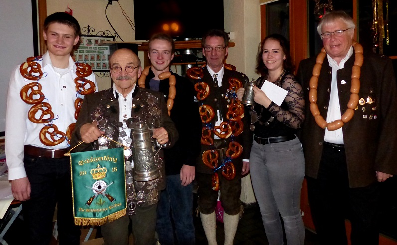 Unser Jugendmitglied Toni Bauer freute sich über den bronzenen Platz des Brezenkönigs nach Patrick Roscher als Wurstkönig. Überraschenderweise wurde die Jugendkönigskette Fabienne Heinen überreicht, welche mit ihrem 65,7 Teiler die jugendliche Königswürde erlangte. Lachend nahm sie die Kette und den silbernen Krug entgegen. „Ich komme nach Jahren wieder zum Schießen und werde gleich Königin!“, strahlte die Siegerin.