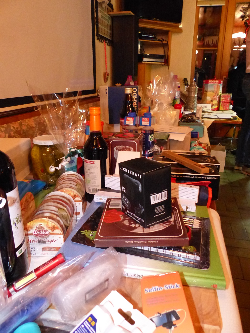 Nach der feierlichen Ehrung unserer Könige kam der lustige Abschluss des Abends: die Verlosung der Spenden vieler Pöckinger Geschäfte und etlicher Schützenmitglieder. Dank der etwa 200 Spendengegenstände konnte fast jedes zweite der ca. 450 verkauften Lose einen lustigen, praktischen oder süßen Gewinn ergattern. Verlost wurden unter anderen edle Armbanduhren, süße Lebkuchen und noch süßere Marshmallows, praktisches Werkzeug, übergroße Nudel- und Nusspackungen, Spirituosen, wertvolle Gutscheine der Pöckinger Geschäfte und Körperpflegeprodukte und vieles mehr...