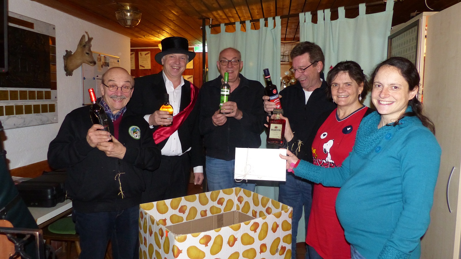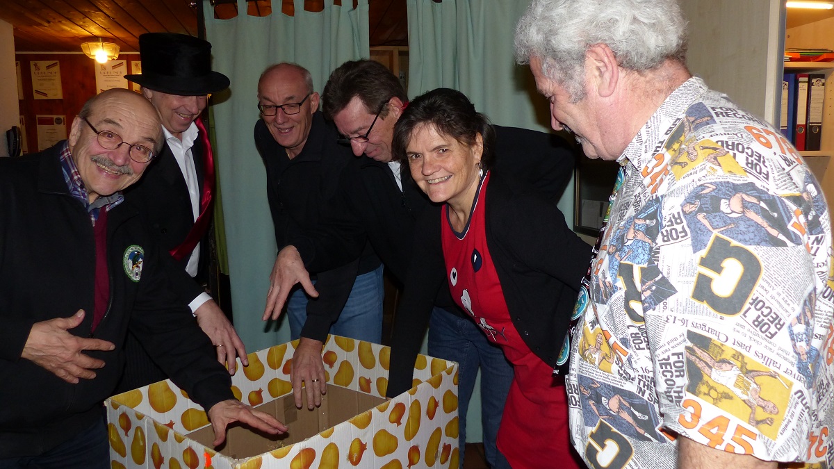 Überraschenderweise gab es nicht nur einen, zwei oder drei Gewinner, die ihr exaktes Alter erschossen und erkegelten – nein; gleich sechs Wildschützenkameraden hatten es geschafft punktgenau „altersgerecht“ zu landen! Schützenmeister Walter Stumpenhausen, Kassier Peter Lange und die Mitglieder Franz Deubzer, Helmut Elischer, Petra Gerl und Tochter Michaela Stumpenhausen durften zugleich in die Kiste voller Stroh greifen und sich ihre Preise ertasten. Von gutem Wein über süße Pralinen bis hin zu erlesenem Balsamico konnten sich die Kameraden aus dem Stroh ziehen.