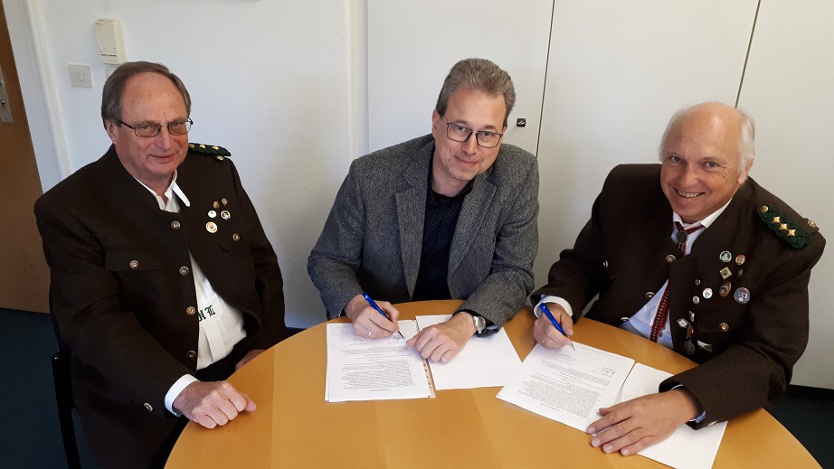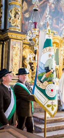 Abschließend kam Walter auf unsere Fahne zu sprechen: Seit es unsere Fahne gibt, seit 1965, sind Karl Pohler und Markus Grossmann „mit unserer Fahne fast verheiratet“, so Walter Stumpenhausen. Karl war von Anfang an ab 1965 Fahnenbegleiter und ab 1971 für 20 Jahre unser Fahnenträger. 1991 hat er dann unsere Fahne in die Hände von Markus Großmann übergeben, der sie bis heute, also seit 26 Jahren, uns voranträgt. Zum Dank und im Namen aller Mitglieder und des Bayerischen Schützenbundes überreichte der 1. Schützenmeister Karl und Markus das Ehrenzeichen für Fahnenabordnungen in Gold.