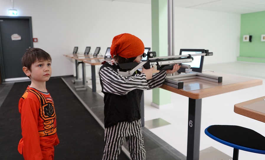 Alle Kinder bewahrten trotz der aufregenden, lustigen Faschingsfeier konzentriert ihre nötige Ruhe. Jeder zielte mit Ehrgeiz auf die roten Scheiben der DISAG Anlage. Auch der schwarze Geist, der kleine rote Ninja und die edle Piratin gaben ihr Bestes.