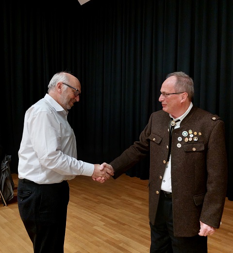 Im Rahmen der Jahreshauptversammlung der Vereinigten Schützengesellschaft Pöcking dankte der 1. SM dem 2. SM Helmut Ledutke für seine außerordentliche Hilfestellungen als Mitglied des Schützenmeisteramtes über 12 Jahre lang und als RWK Leiter der Seniorenmannschaft. Walter dankte Helmut für seinen Einsatz mit den meisten Arbeitsstunden beim Bau des Schützenhauses und dem Neuanfang im neuen Schießstand. Er überreichte Helmut Ledutke die Silberne Ehrennadel des Schützenbezirks Oberbayern, die sogenannte, „Silberne Gams“.